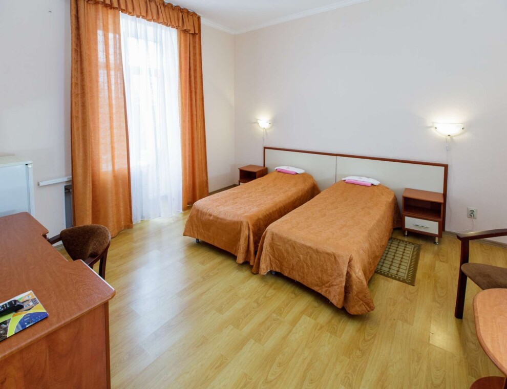В номере: зеркало, кровати односпальные /одна двуспальная кровать, прикроватные тумбочки, стол, столик журнальный, стул, шкаф, сейф, сплит-система: только в корпусе 2, телевизор ЖК, холодильник, чайный набор посуды, санузел с душевой кабиной.