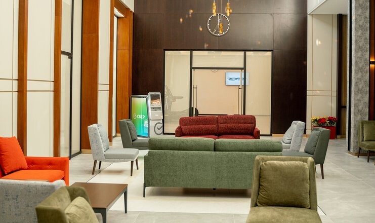 - На первом этаже расположен ресепшен. Рядом с ним — лобби-бар «Звёздное небо» оснащен большим экраном для просмотра фильмов.