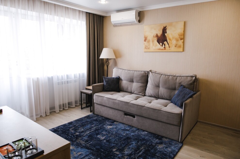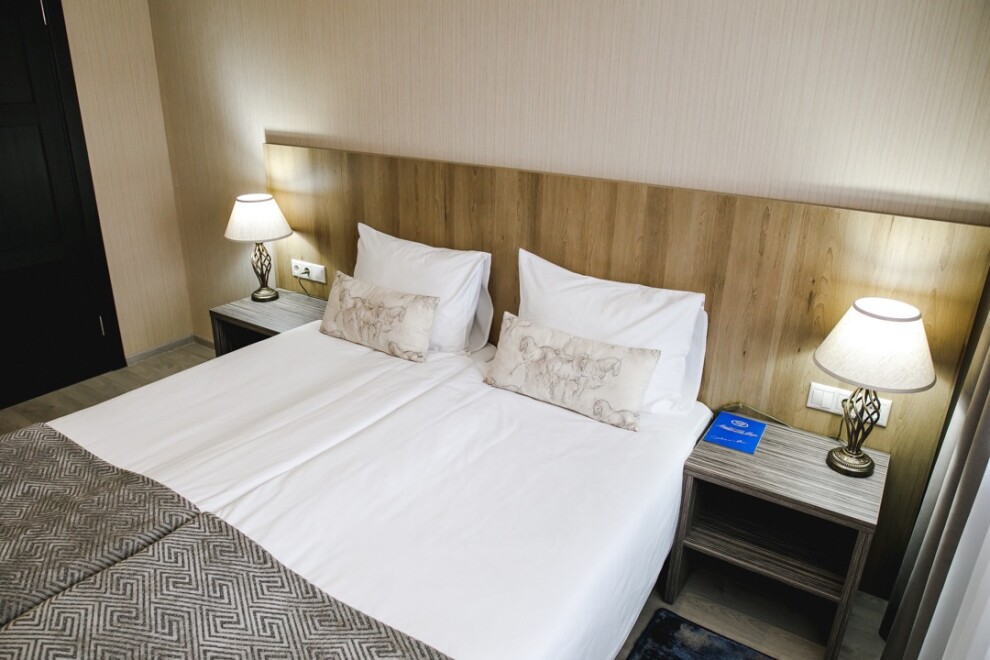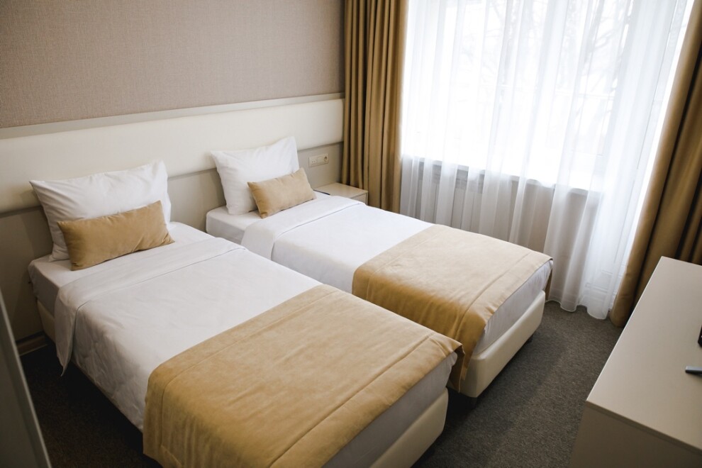 Стандарт - это уютный однокомнатный номер площадь номера 16 кв. Номер оснащен одной 2-спальной или двумя 1,5 -спальными кроватями, телевизором, холодильником, кондиционером, чайным набором.