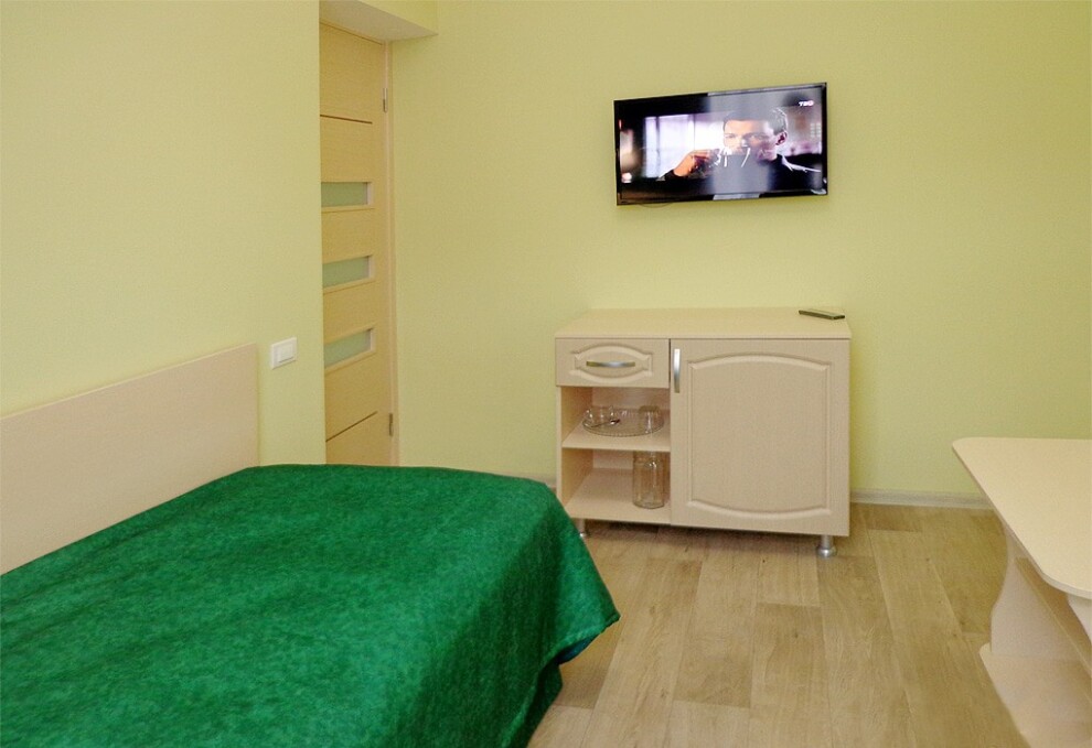 Оснащение номера: чайник, телевизор, холодильник, спальня, ванная комната.